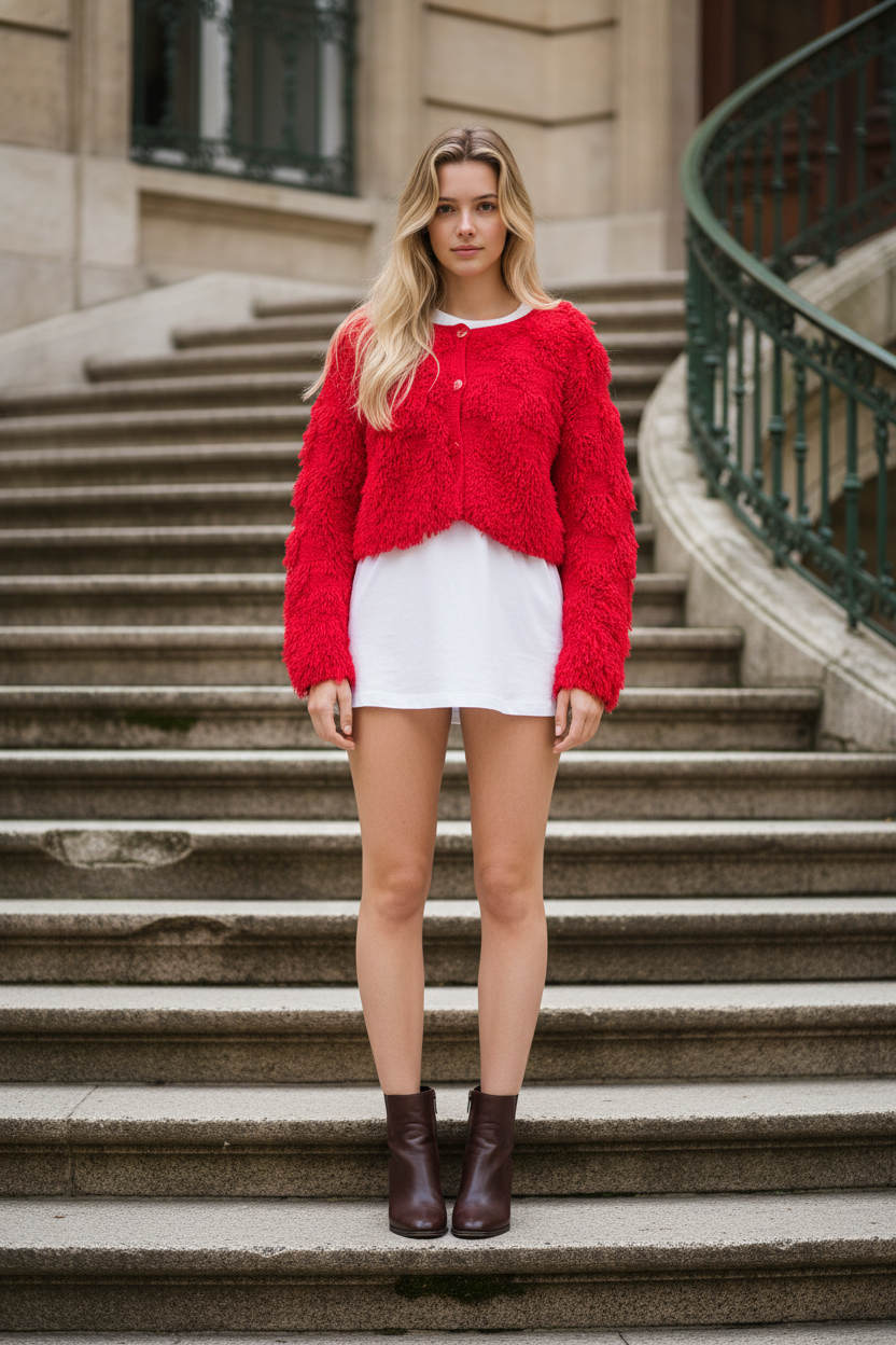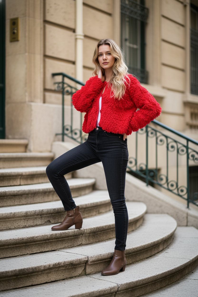 Coupe légèrement cropped, manches longues,fermeture par bouton pour un porté modulable.